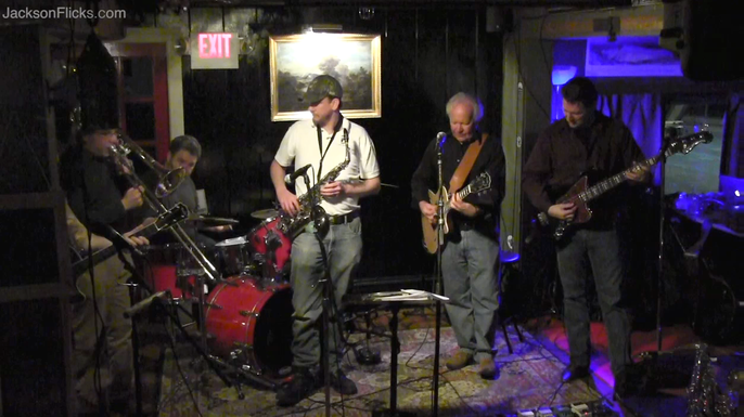 Tonight was a hoot. Trombone, Saxaphone, Fiddle, Bass with a two drummers and few Guitars. Image below is from Al Shafner's clip with Andy Brosnan (drums), Swampdog (drums), Tom Mooney (sax), Jonathan (bass), Cindy Duchin (fiddle), Peter Heimlich (guitar), and George Wiese (trombone). Cindy and Peter are obscured behind the post.
